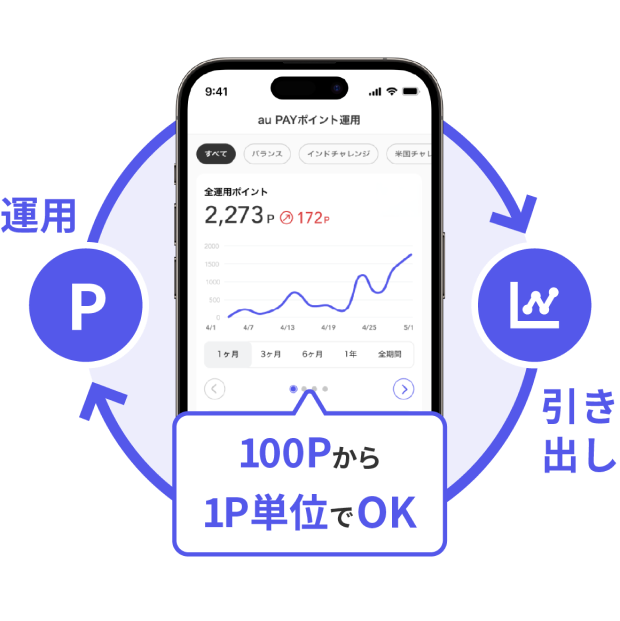 お持ちのPontaポイントの中から運用したいポイント数(100ポイントから)を「追加」します。また、「運用ポイント」はPontaポイントへ「引き出す」ことができ、auの各種サービスでご利用いただけます。 -